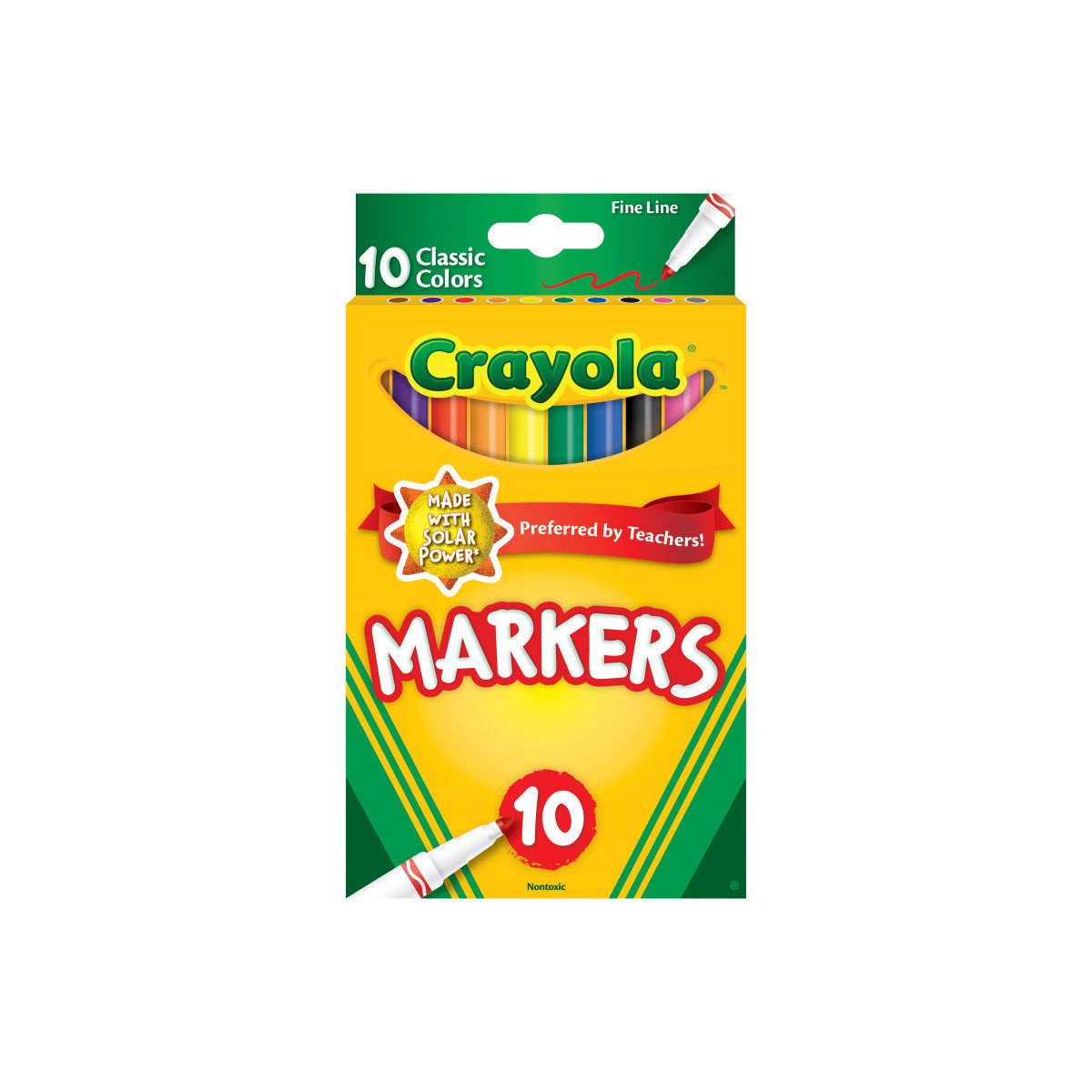 Kids can color in the little details with this this 10 Count Crayola Fine Line Marker Set. The Non-Toxic Markers in Classic Colors are safe for children and perfect for school supplies and at-home art supplies. When imagination and precise, bold color come together, little artists will bring all kinds of art projects to life! This assortment of markers features 10 classic Crayola colors with high-quality, true-to-color ink. Add bold, vibrant color to artwork, school assignments, and other creative projects. The variety of bright, classic colors in this pack invites imaginative expression. With a slender tip, each Fine Line Marker is a precise drawing tool. Ideal for coloring in small areas, these markers are also great for writing or drawing thin lines or dots. These markers lay down plenty of vibrant color and won't smudge or bleed through paper. Each pack includes 10 markers.