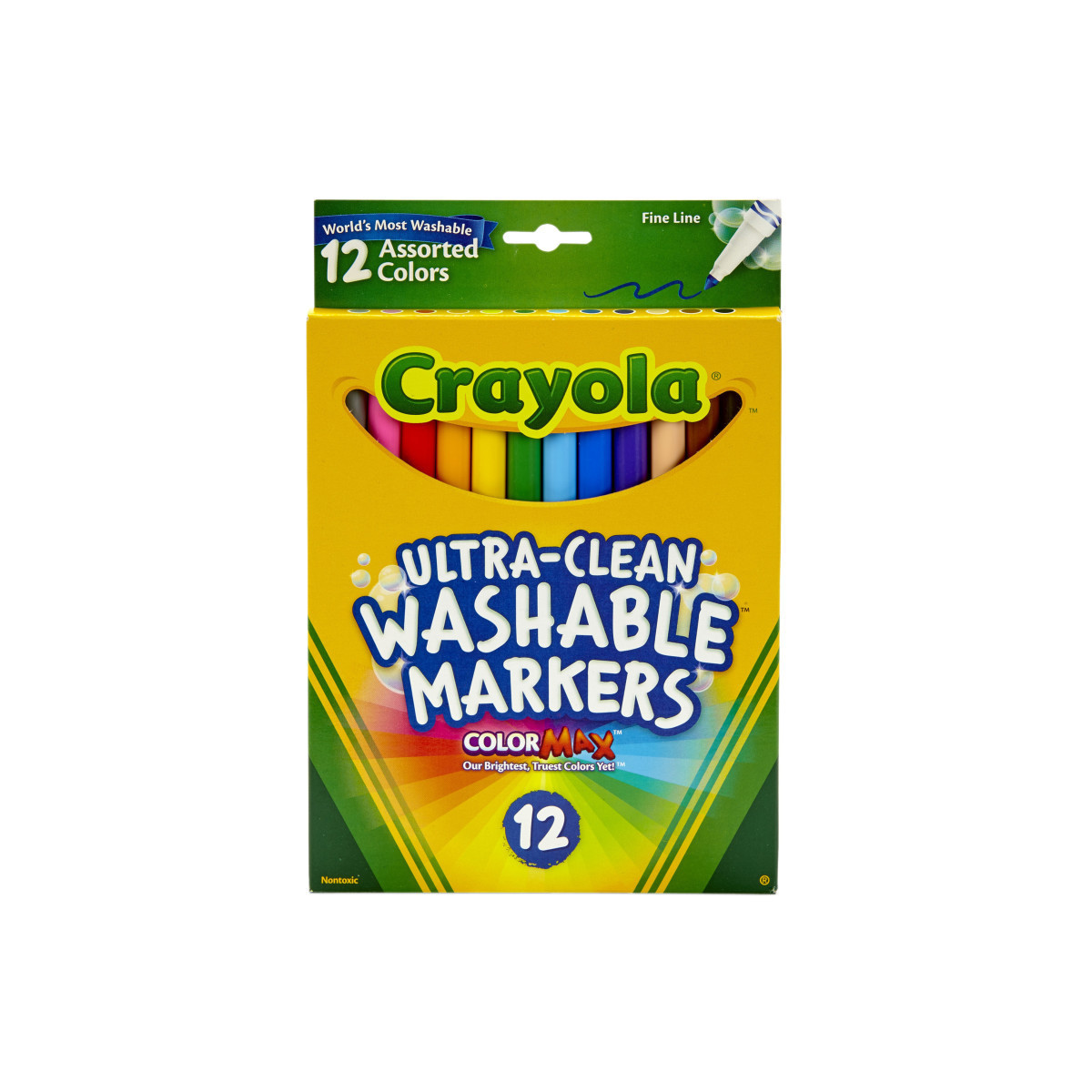 Fine Line Markers provide artists with 12 classic Crayola colors that feature Color Max - our brightest, truest colors yet. Amp up school projects and artistic endeavors with high-quality ink that is true to color. The variety of bright, classic colors in this pack invites imaginative expression. With its slender tip, the Fine Line Marker is a precise drawing tool. Perfect for coloring in small areas, these markers are also great for writing or drawing thin lines or dots. These markers lay down plenty of vibrant color and won't smudge or bleed through paper. The world's most washable non-toxic markers now come in an improved Ultra-Clean formula that washes easily from skin, clothing, and common household surfaces—even painted walls. Crayola Markers contain recycled plastic resin, which keeps hundreds of tons of plastic out of landfills every year. Bring beauty and color to your world and help keep plastic out of landfills. Each box includes 12 Crayola Ultra-Clean Fine Line Markers in assorted colors.