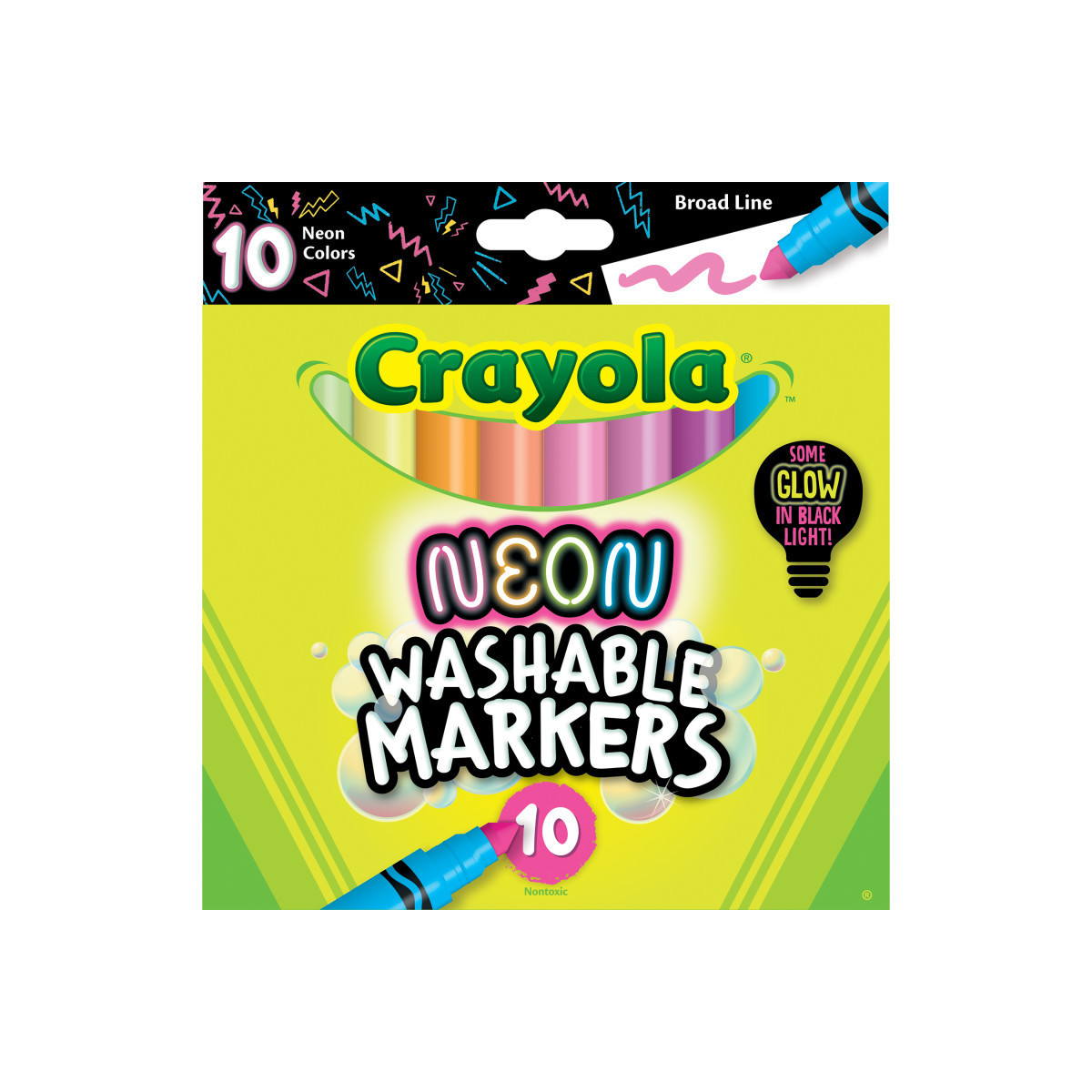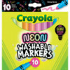 Dive into a spectrum of dazzling hues with this pack of Crayola Neon Washable Markers! These aren't just any markers - they are a vibrant selection of 3 bright neon colors and 7 fluorescent shades that turn an ordinary drawing session into a glowing extravaganza, especially under a blacklight. Imagine the masterpiece you can craft with vivacious colors like Electric Lime, Atomic Tangerine, and Shocking Pink, alongside the mystical glow of Laser Lemon and Purple Pizzazz. Designed with robust conical tips, Crayola Broad Line Markers are perfect for all sorts of artwork, from bold strokes to delicate details, ideal for enriching classroom activities and group projects. Plus, no need to worry about messes, as these markers are washable from skin and most fabrics. Give these markers as a gift for boys and girls on birthdays, holidays, or just because. Safe and nontoxic, great for ages 3 and up.