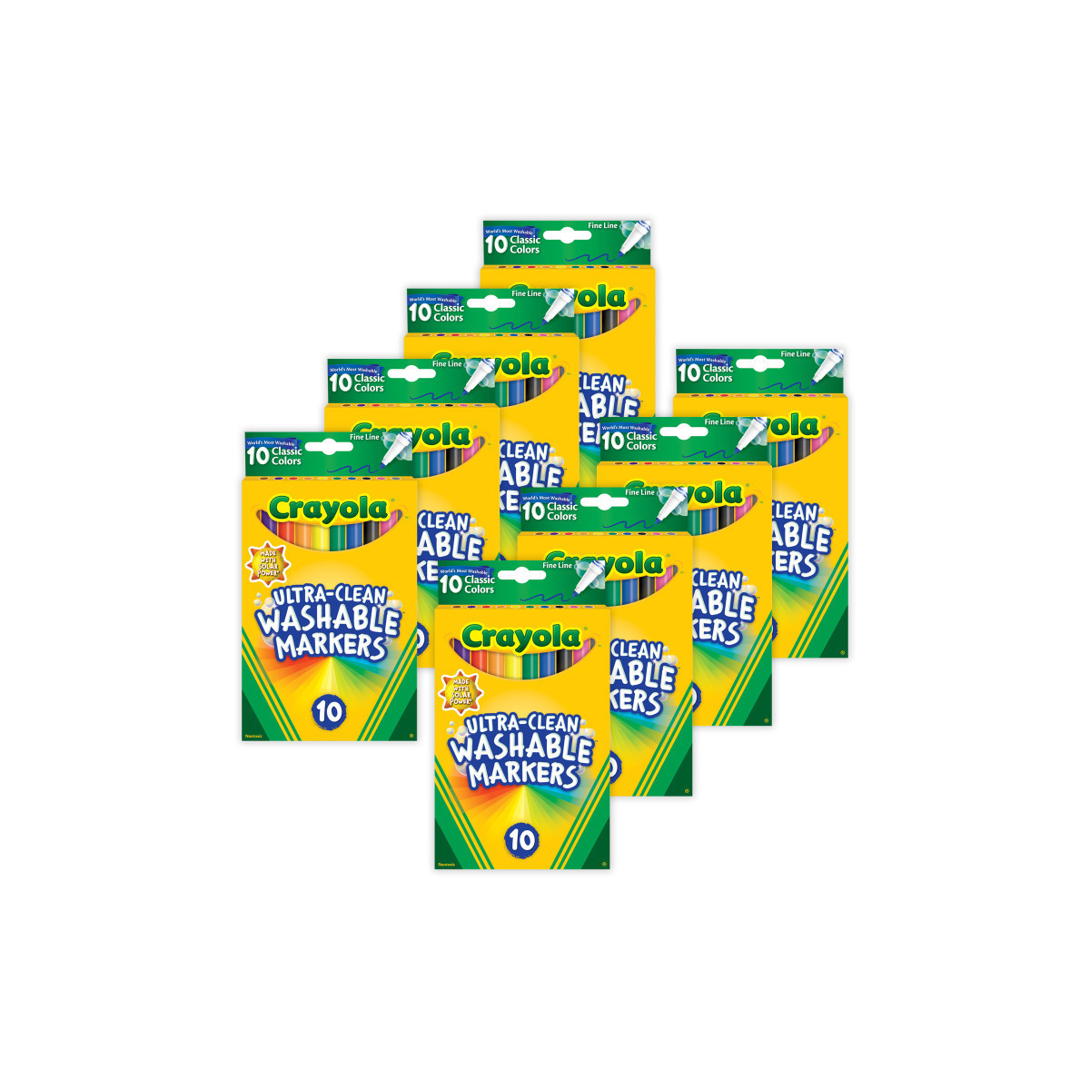 Kids love to get creative with color, but parents want to keep the color where it belongs and easily remove it where it doesn't! Crayola Ultra-Clean Fine Line Bold Markers now have an improved Ultra-Clean washable formula and come with two new bold colors. These durable fine-line markers are ideal for writing, drawing, or coloring in small areas. Fine Line Markers provide artists with 10 classic Crayola colors that feature Color Max – our brightest, truest colors yet. Amp up school projects and artistic endeavors with high-quality ink that is true to color. The variety of bright, classic colors in this pack invites imaginative expression. With its slender tip, the Fine Line Marker is a precise drawing tool. Perfect for coloring in small areas, these markers are also great for writing or drawing thin lines or dots. These markers lay down plenty of vibrant color and won't smudge or bleed through paper. The world's most washable non-toxic markers now come in an improved Ultra-Clean formula that washes easily from skin, clothing, and common household surfaces—even painted walls. Each pack includes 10 markers. Sold as 8 packs for a total of 80 markers.