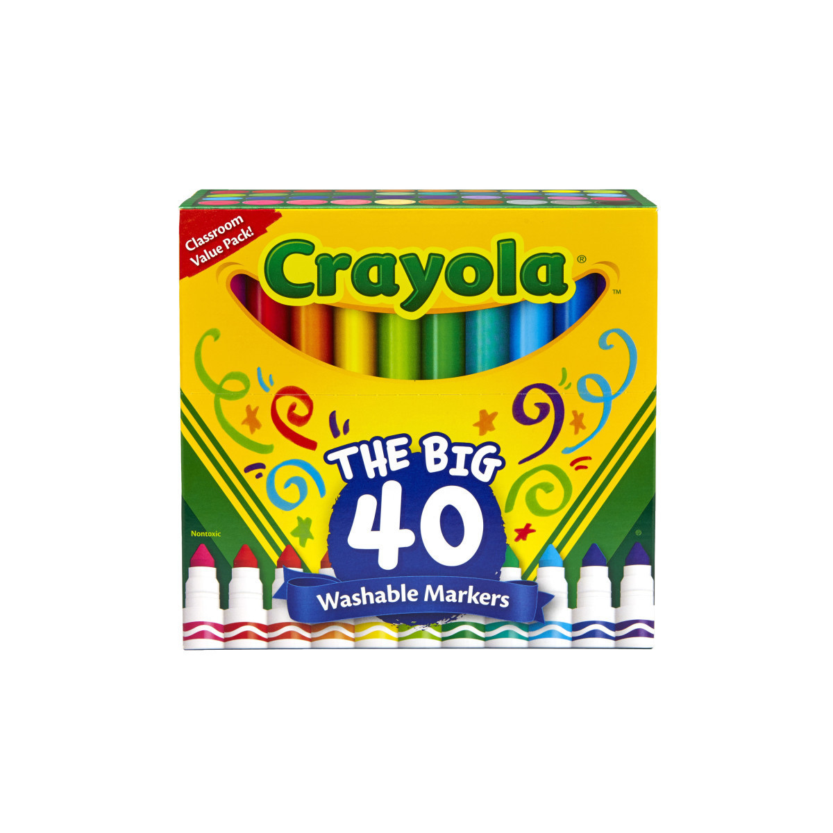 With its conical tip, the Crayola Broad Line Marker is a versatile drawing tool. Perfect for coloring in large areas, these markers are also great for drawing thin lines or dots. Kids can even create a ribbon effect with lines that taper from thick to thin. Broad line markers lay down plenty of color and won't smudge or bleed through paper. The world's most washable non-toxic markers now come in an improved Ultra-Clean formula that washes easily from skin, clothing, and common household surfaces--even painted walls. Crayola Markers contain recycled plastic resin, which keeps hundreds of tons of plastic out of landfills every year. Bring beauty and color to your world and help keep plastic out of landfills. Includes 40 Crayola Broadline Markers in one BIG pack!