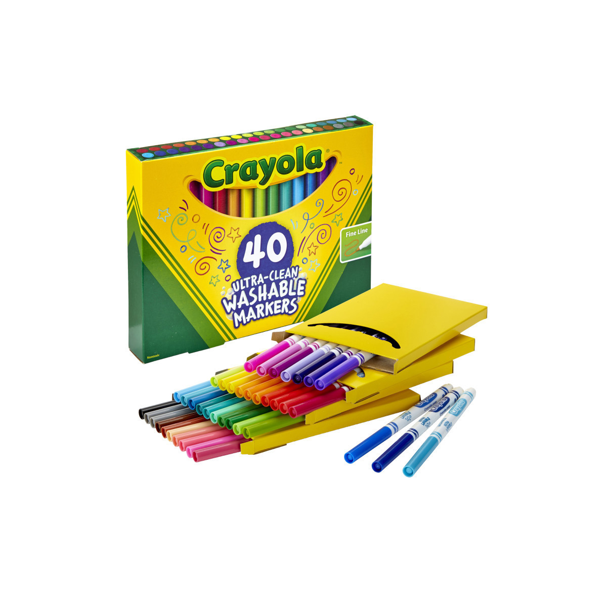 Fine Line Markers provide artists with 40 classic Crayola colors that feature Color Max - our brightest, truest colors yet. Amp up school projects and artistic endeavors with high-quality ink that is true to color. The variety of bright, classic colors in this pack invites imaginative expression. With its slender tip, the Fine Line Marker is a precise drawing tool. Perfect for coloring in small areas, these markers are also great for writing or drawing thin lines or dots. These markers lay down plenty of vibrant color and won't smudge or bleed through paper. The world's most washable non-toxic markers now come in an improved Ultra-Clean formula that washes easily from skin, clothing, and common household surfaces--even painted walls.