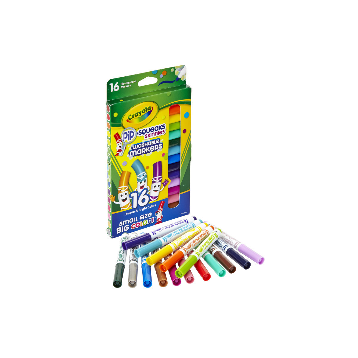 They may be small but these Crayola Pip-Squeaks Skinnies color mighty big pictures. Sized for kids hands, your child will love how easy the markers are to handle. Pip-Squeaks Skinnies are non-toxic and washable - a little soap and water takes the ink off children's hands and most surfaces. They're a win-win choice for both kids and parents. Each pack includes 16 Pip-Squeaks Skinnies markers in unique and bright colors.