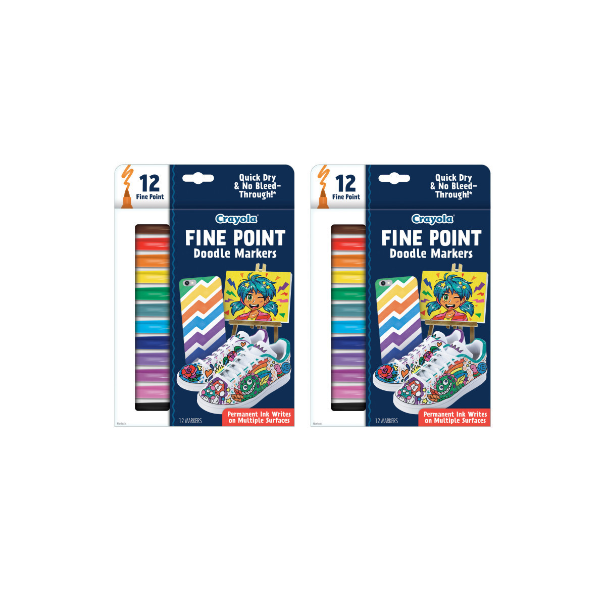 Define each and every detail of your next work of art with the Crayola Fine Point Doodle Markers. They are perfect for fine details and doodles, offering intense permanent ink that won't smudge or bleed through! Use them to practice creative lettering, detail handmade cards, decorate notebooks, bullet journal, and so much more. Whether you are stocking up on school supplies or replacing your marker set at home, these permanent markers are intended for aged-up artists. Pair them with coloring books for a bundled birthday gift. They are ideal for teens and adults, but safe for ages 8 & up. Each pack includes 12 markers. Sold as 2 packs for a total of 24 markers.