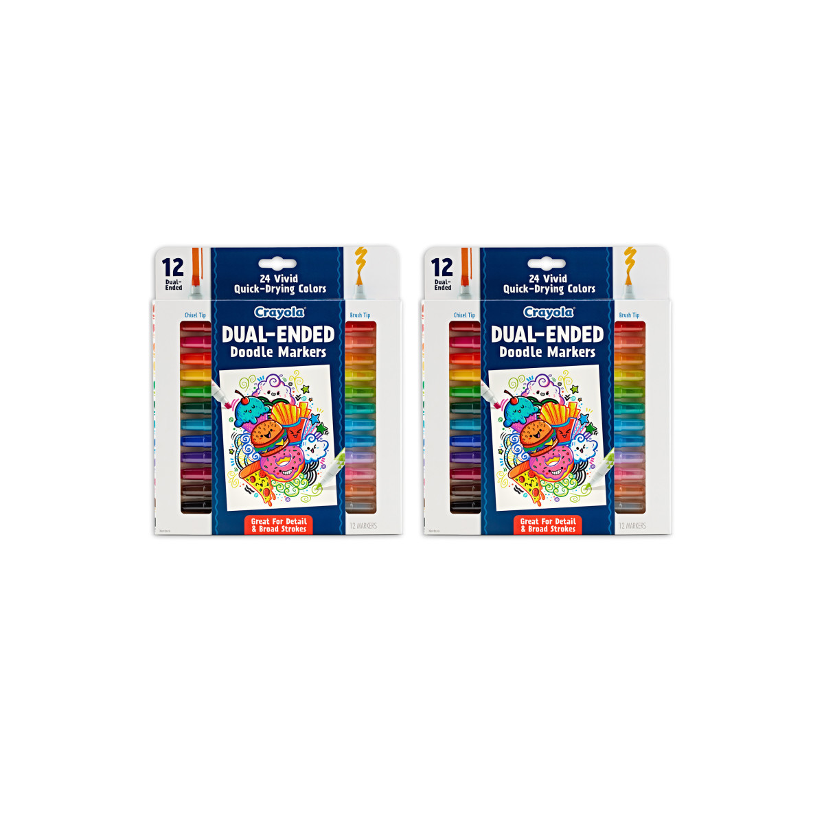 Create with definition, thanks to a tool that offers twice the level of detail and twice the color. Each of the Crayola Dual-Ended Markers feature two colorful tools in one! Create wispy watercolor-like areas of color with the brush marker end and thick or thin lines with the chisel tip end. These Crayola markers make a great gift for teens with an interest in creative lettering, as well as those who just want to experiment more with their art markers. These markers are ideal for teens and adult coloring enthusiasts, but are safe for ages 8 & up. Each pack includes 12 markers, giving you 24 colors total. Sold as 2 packs for a total of 24 markers.