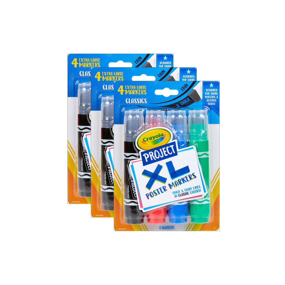 From the Crayola Project line, these supersized markers are perfect for a variety of full-coverage art projects and crafts. Create super thick lines with these bold, extra-wide chisel tips. School projects, presentations, posters, signs and decorations stand out with crisp, wide lines in classic colors. Ideal for adults and kids, ages 6 and up. Each set includes 4 XL Poster Markers in classic colors: Black, Green, Blue, and Red. Sold as 3 packs for a total of 12 markers.
