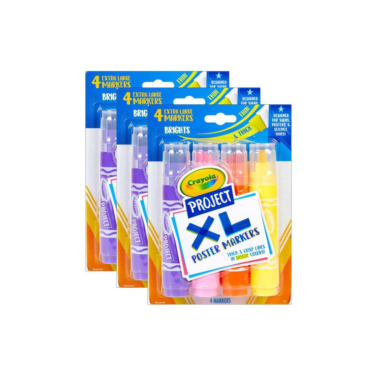 From the Crayola Project line, these supersized markers are perfect for a variety of full-coverage art projects and crafts. Create super thick lines with these bold, extra-wide chisel tips. School projects, presentations, posters, signs and decorations stand out with crisp, wide lines in classic colors. Ideal for adults and kids, ages 6 and up. Each set includes 4 XL Poster Markers in bright colors: Violet, Magenta, Yellow, and Orange. Sold as 3 packs for a total of 12 markers.