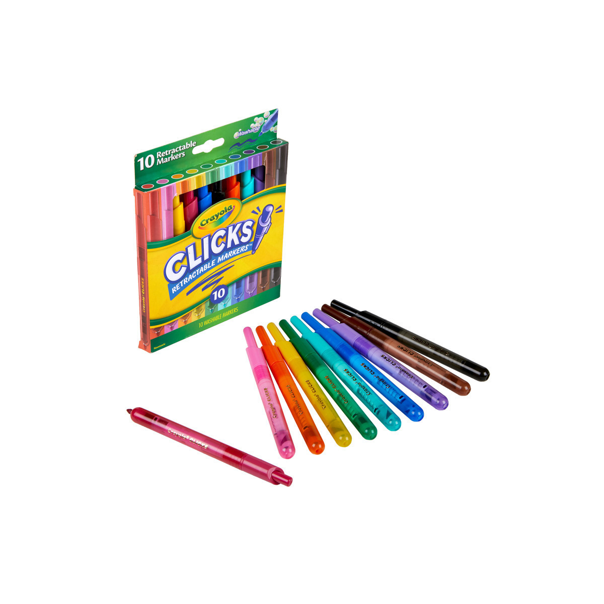 No more lost caps or dried-out markers! Crayola Clicks Washable Markers are retractable with special ink that is designed to resist drying out. Their conical tips make it possible to create thick and thin lines, while the easy-click design makes them ideal for coloring on the go! Prepare for school projects, crafts, and homework assignments with vibrant colors that wash from skin as well as most washable clothing. Pair this marker set with giant coloring pages or activity books (sold separately) for hours of colorful, creative fun! This set comes with 10 classic colors, ideal for a variety of creative projects.