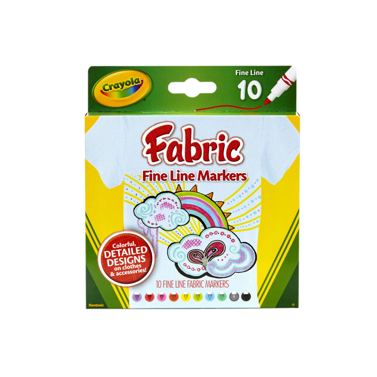 Crayola Fabric Markers let you create wild, colorful designs on clothes and accessories. Fine tip allows for intricate details! Works great on most cotton or polyester garments! Saturate the cloth with ink, then allow it to dry. Colored artwork is permanent and completely washable after heat-setting. Try these markers on T-shirts, tote bags, cloth napkins and placemats, hats and much more. AP Seal, non-toxic. Each pack includes 10 fine line Fabric Markers.