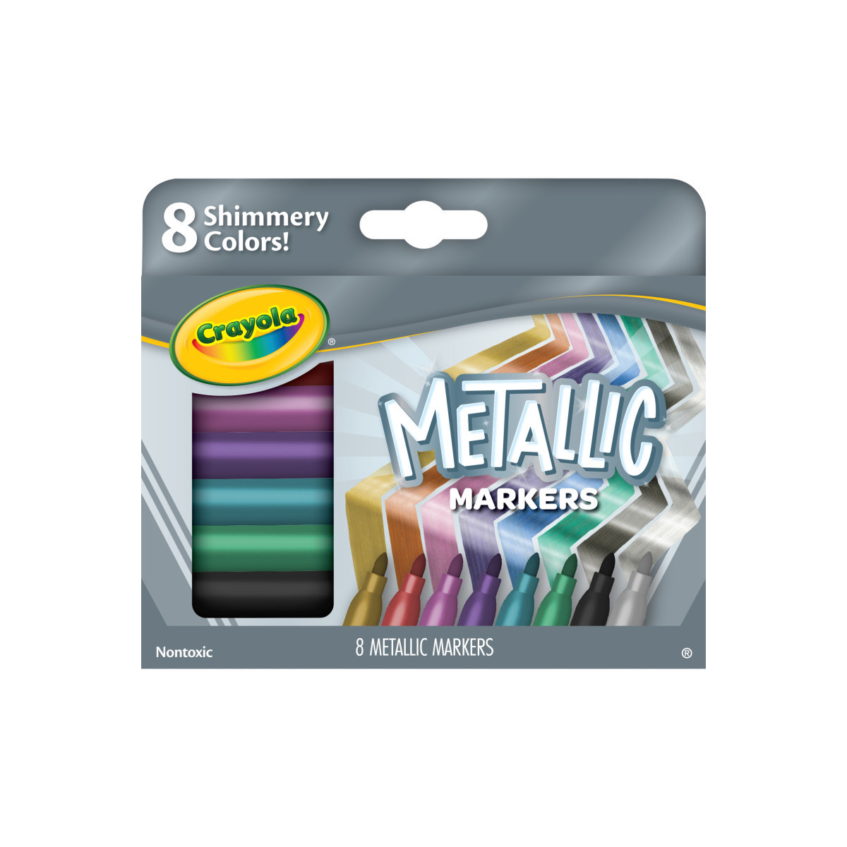 Bring sparkle & shine to your art projects and crafts with Crayola Metallic Markers! This 8 count Metallic Marker set includes Purple Steel, Gold Ingot, Pink Bling, Black Iron, Cobalt Blue, Slick Silver, Green Machine, and Copper Mine. These versatile markers work on a variety of surfaces such as Construction Paper, Poster Board, and Regular Paper. Add details that pop on light and dark surfaces creating definition in your artwork that catches the eye. From back-to-school supplies to seasonal crafts and creative play, these markers make a terrific addition to any color collection at home. Ideal for kids and fans of adult coloring, they are nontoxic and safe for ages 3 & up.