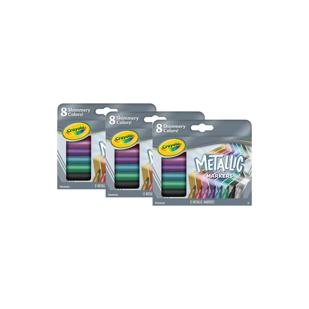 Bring sparkle & shine to your art projects and crafts with Crayola Metallic Markers! Each 8 count Metallic Marker set includes Purple Steel, Gold Ingot, Pink Bling, Black Iron, Cobalt Blue, Slick Silver, Green Machine, and Copper Mine. These versatile markers work on a variety of surfaces such as Construction Paper, Poster Board, and Regular Paper. Add details that pop on light and dark surfaces creating definition in your artwork that catches the eye. From back-to-school supplies to seasonal crafts and creative play, these markers make a terrific addition to any color collection at home. Ideal for kids and fans of adult coloring, they are nontoxic and safe for ages 3 & up. Sold as 3 packs for a total of 24 markers.