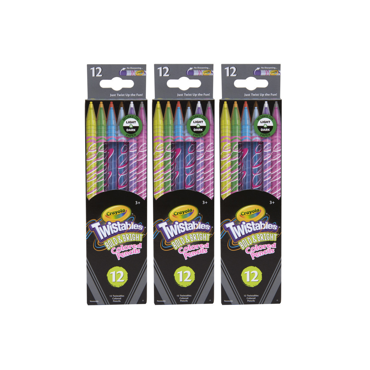 Crayola Twistables Colored Pencils are the easy way to color on the go, and now they are available in Bright & Bold colors that work on both light and dark paper! Avoid waiting for a sharpener to continue using your favorite colors or cleaning up pencil shavings that always end up creating a mess, these colored pencils don't require sharpening. Simply twist up for more color, or twist down to protect the color core. The plastic casing makes it easy to see how much color is left, while the pencil size never changes, so it's always easy to hold. Pair with Bold & Bright crayons and markers (each sold separately). They are perfect for classrooms and craft rooms, eliminating those tiresome sharpener lines! Each pack includes 12 pencils. Sold as 3 packs for a total of 36 pencils.