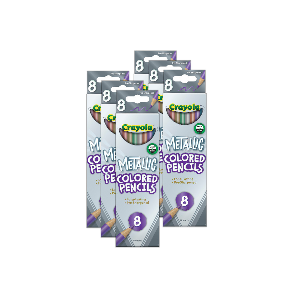 Add glimmer and glam to your artwork with Crayola Metallic Colored Pencils. This set of shimmering art tools is perfect for creative art projects and drawing activities. Metallic colored pencils create metal-like effects on a variety of surfaces, and show up especially well on dark paper. Use these unique pencils for cardmaking, adult coloring books, school projects and more! Safe and nontoxic, ages 5 and up. Each pack includes 8 different colors offer great metallic color variety: Green, Blue, Purple, Mauve, Gold, Silver, Copper, and Bronze. Sold as 6 packs for a total of 48 pencils.