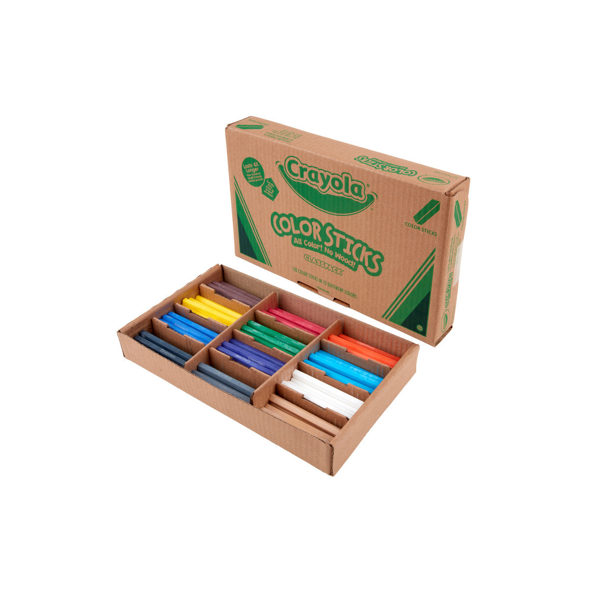 Crayola Color Sticks are woodless colored pencils that avoid sharpening waste! They have 5 points for fine lines or writing, 5 flat sides for broad strokes, and are comfortable and easy to hold. This 120-count Classpack has enough nontoxic coloring tools for the entire classroom or any large group. With the entire stick made of a solid color, these versatile art supplies allow artists to create both thick color strokes and fine lines. They make blending and shading more easily achieved, simply by adjusting your hand pressure. Plus, teachers will love the organized storage container that helps keep these classroom supplies organized! Open up the bulk color sticks and let students’ imaginations run free with the 12 assorted colors. Packaging, contents, and colors may vary. We recommend retaining packaging for future reference. Safe for kids & adults, ages 4 & up.