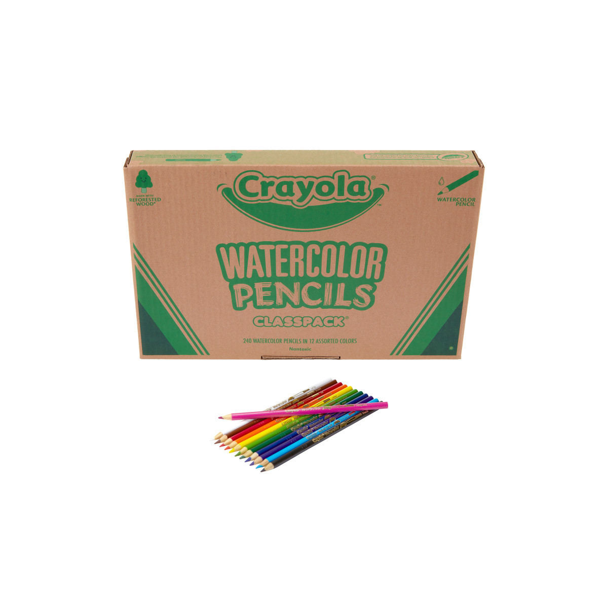 Stock up on Crayola Watercolor Pencils for the whole classroom to share! This 240ct Bulk Watercolor Colored Pencils set features 12 assorted colors including: Sky Blue, Red, Blue, Magenta, Orange, Violet, Brown, Yellow, Green, Yellow Green, White, and Black. These unique Colored Pencils work with water to create fun watercolor effects, as well as dry for a more traditional coloring experience. With sticks of each color, this box is designed to last through DIY crafts, arts and crafts projects, and homework assignments all year long. Made from reforested wood and pre sharpened for easy use, Crayola is committed to providing premium quality drawing tools for artists of all ages. Safe and nontoxic, ideal for children ages 3 and up.