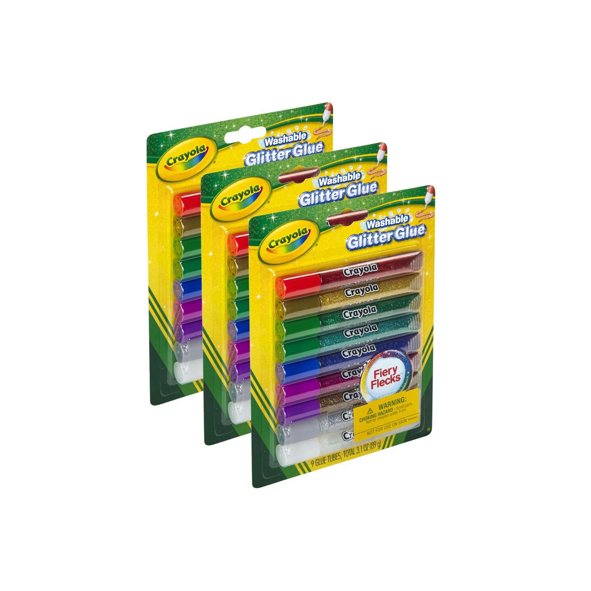 Dazzling, decorative glue in a variety of sparkling colors! Perfect for crafts, scrapbooking, school projects and much more. Add sparkle to any project, at home or in the classroom. Crayola Glitter Glue squeezes out easily and dries in 30 minutes, so kids can make their artwork shimmer anytime. Each pack includes 9 washable assorted colors. Sold as 3 packs for a total of 27 tubes of glitter glue.