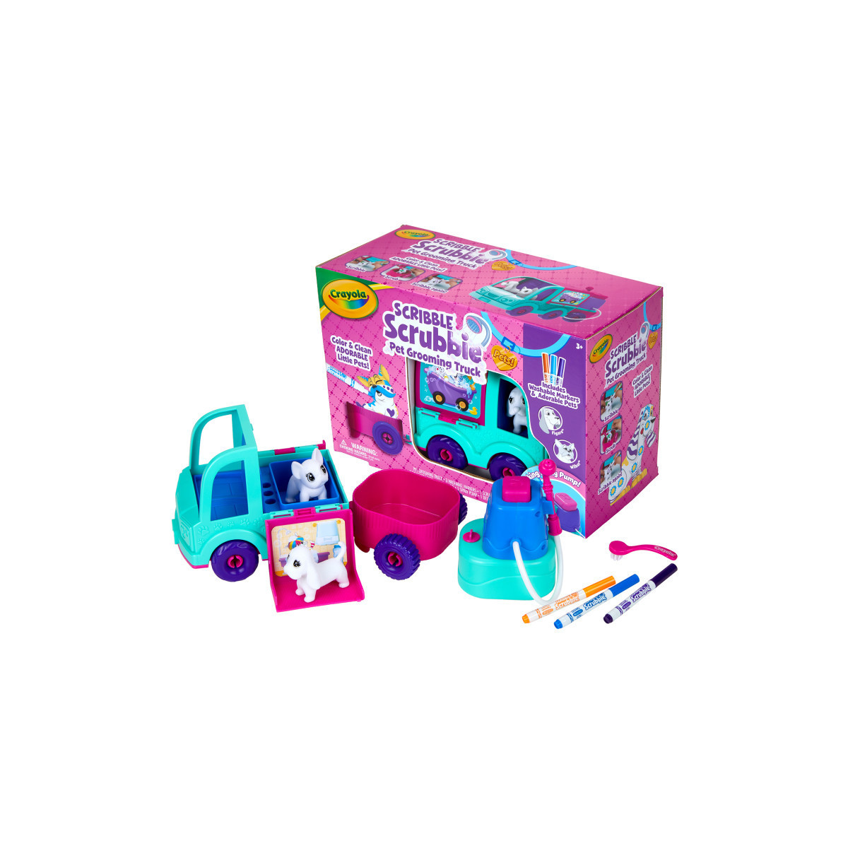The Scribble Scrubbie Grooming Truck could be rolling into your home soon! This mobile play set is the fun way to take care of your Scribble Scrubbie pets' needs—then just fold it up and roll! All Crayola Scribble Scrubbie pets are washable so you can color & customize with the included markers then wash them and start again. Features 1 Toy Truck with cart and hand-pump hose, 2 Scribble Scrubbie Pets, 3 Washable Markers, and 1 Brush. Ideal birthday or holiday gift for girls and boys. Perfect for kids, ages 3 and up.