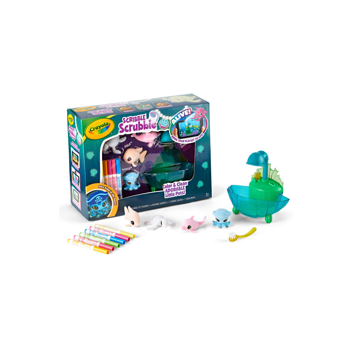 Scribble Scrubbie Pets just got a GLOW up! Kids will love this adorable Lagoon Playset where pets glow and come to life through artificial intelligence. Transform your room into an underwater world & bring pets to life in your home with the Crayola Scribble Scrubbie Glow Lagoon set & the free Scribble Scrubbie App. This fun and unique toy for girls & boys includes 4 Glow Pets, 6 Markers, 1 Tub, and 1 Brush. Meet Marco, Polo, Sydney, and Toby! Each of these fun pets can be colored and then washed in the working tub! Great for ages 3 and up!