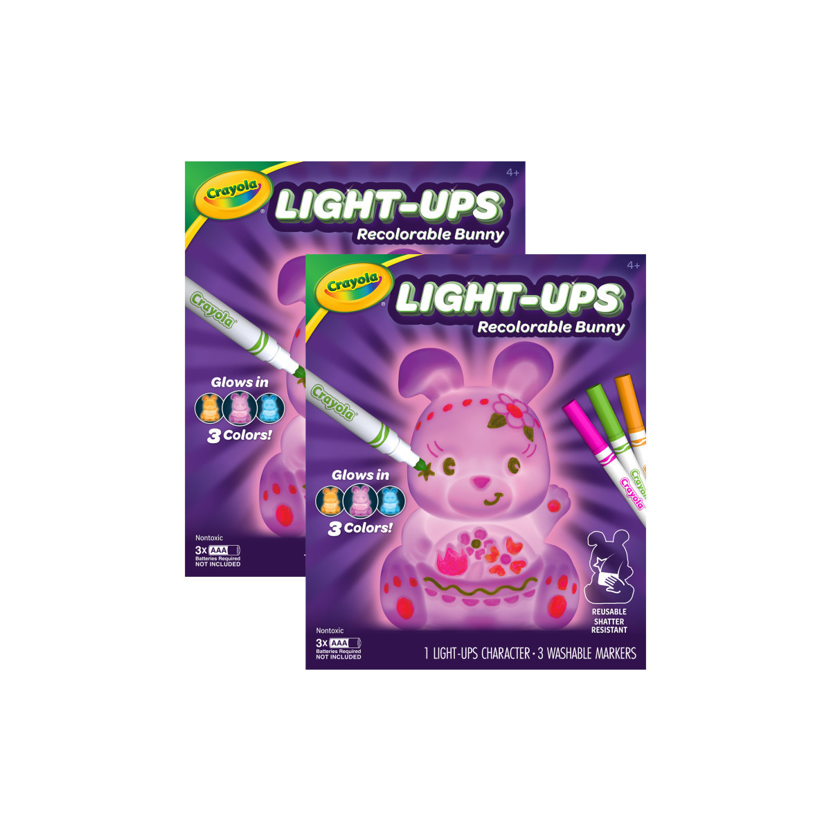 WHAT'S INCLUDED: Sold as 2 sets, each set includes 1 Recolorable Light-Ups Bunny, 3 Ultra-Clean Washable Markers, and 1 Instruction Sheet (3 AAA batteries required - not included).