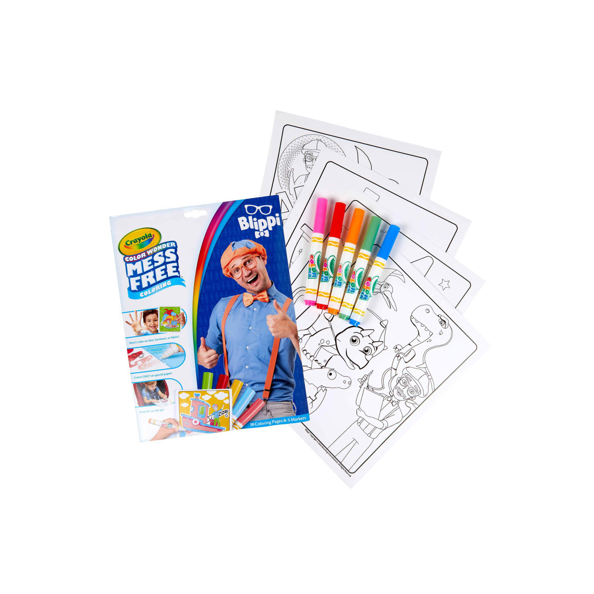 Kids can color their favorite, fun-loving friend, Blippi, in a mess-free way with Crayola Color Wonder! Color Wonder colors appear only on special Color Wonder paper, not on skin, clothing, or carpets. This set contain 18 fun-filled coloring pages depicting silly scenes featuring Blippi and his play-and-learn adventures! Each page works with all Color Wonder markers, paints and stamps. The convenient "foldalope" packaging works as reusable storage for your coloring pages and markers. Includes 18 Blippi pages and 5 Color Wonder Markers. Makes a great gift for girls and boys ages 3 and up!
