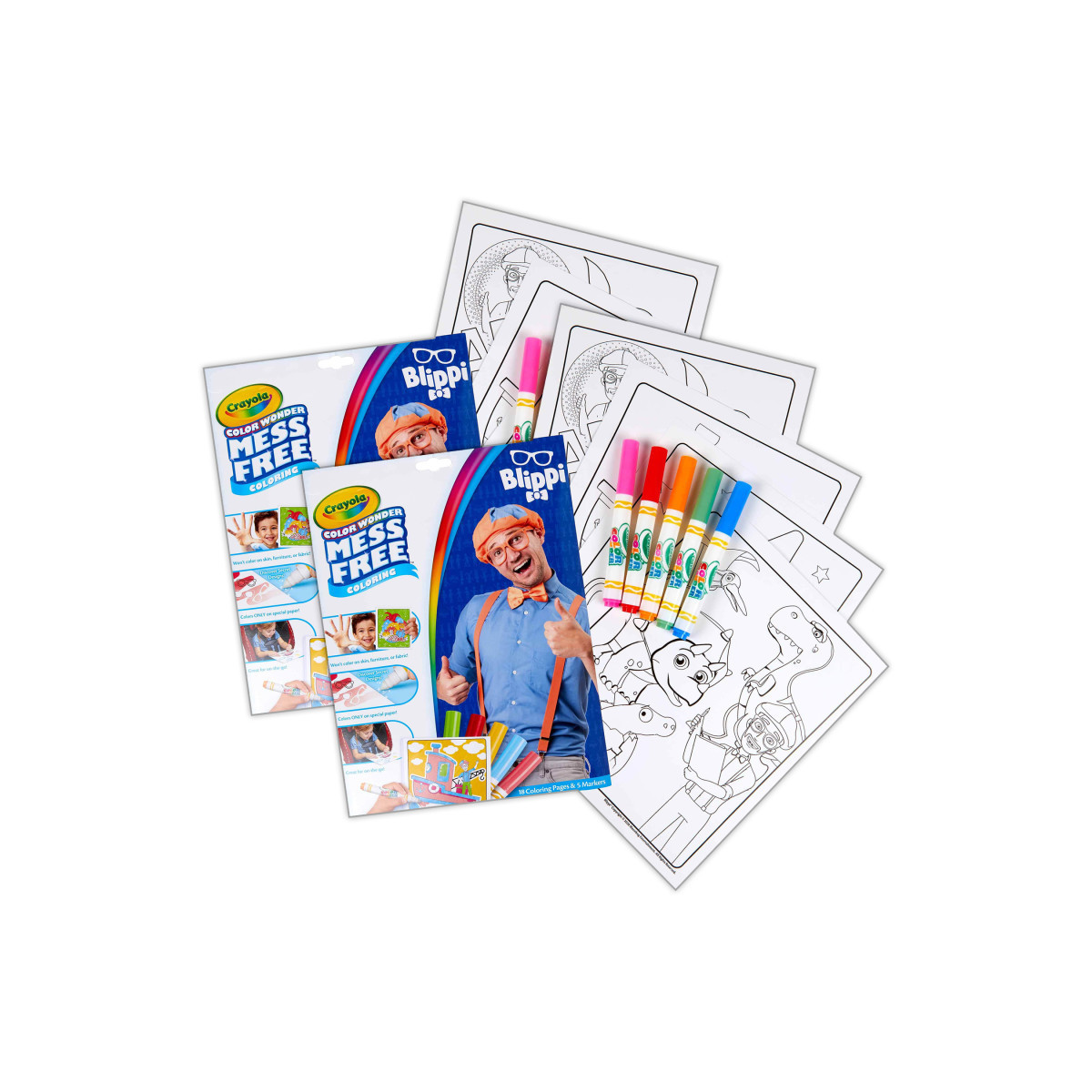 Kids can color their favorite, fun-loving friend, Blippi, in a mess-free way with Crayola Color Wonder! Color Wonder colors appear only on special Color Wonder paper, not on skin, clothing, or carpets. Each set contain 18 fun-filled coloring pages depicting silly scenes featuring Blippi and his play-and-learn adventures! Each page works with all Color Wonder markers, paints and stamps. The convenient "foldalope" packaging works as reusable storage for your coloring pages and markers. Makes a great gift for girls and boys ages 3 and up! Each set includes 18 Blippi pages and 5 Color Wonder Markers. Sold as 2 complete sets.