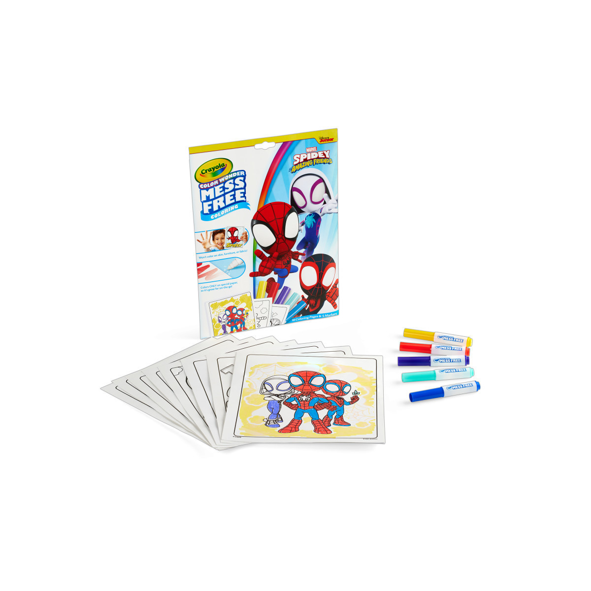 Kids can color their favorite webslinger in a magical, mess-free way with Crayola Color Wonder! Color Wonder colors appear only on special Color Wonder paper, not on skin, clothing, or carpets. This set contain 18 action-packed coloring pages depicting scenes starring Peter Parker as Spider-Man, and featuring many of his friends from the Spider-Verse, including Miles Morales as well as other Marvel Universe friends! Each page works with all Color Wonder markers, paints and stamps. The convenient "foldalope" packaging works as reusable storage for your coloring pages and markers. Includes 18 Spidey pages and 5 Color Wonder Markers. Makes a great gift for girls and boys ages 3 and up!