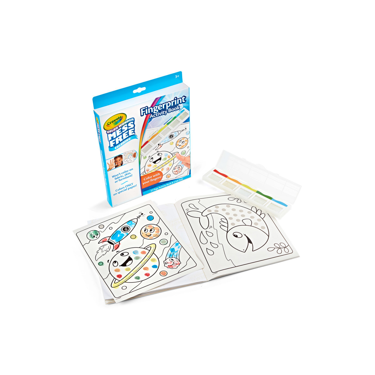 Fingerprint Painting is magical with the Color Wonder Fingerprint Ink Painting Activity Set! This Color Wonder Ink Set includes the Ink Pad Tray featuring 5 colors, and a 27 Page Fingerprint Activity Book, so kids can start creating right away! The Color Wonder Clear Fingerprint Inks only reveal their color on special Color Wonder Paper, not on skin, clothing, or walls. So kids can explore a new way to fingerpaint, and moms can let them create without worry! This Color Wonder Fingerprint Ink Pad and Activity set is designed to prevent dry up, so kids can use it again and again. Makes a great holiday or birthday gift for kids ages 3 and up!