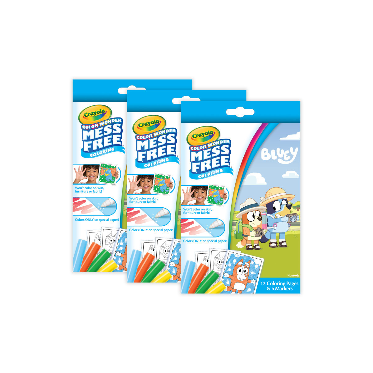The Crayola Color Wonder Bluey Mini Box Set is a mess free coloring activity that features 12 Bluey Coloring Pages and 4 Color Wonder Mess Free Markers. This toddler coloring kit is sure to captivate young minds as they color their favorite Bluey characters! Parents will also appreciate that the Color Wonder markers are mess-free and will only appear on the special Color Wonder paper, preventing stains on skin, clothing, or carpets. Give this set as a fun and creative gift for toddlers or preschoolers who love all things Bluey and want to express their creativity in a safe and fun way. Crayola Markers are nontoxic and ideal for ages 3 and up. Sold as 3 complete sets for a total of 36 coloring pages and 12 markers.