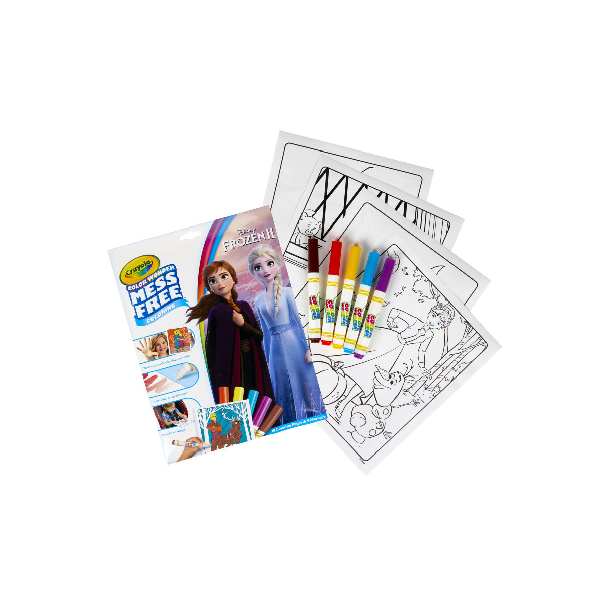Bring home the joy of Disney's Frozen 2 with a mess free coloring experience! Color Wonder Markers only show up on specially formulated Color Wonder Paper, so no stains on skin, clothing, or furniture. The envelope-style packaging doubles as a unique storage solution, allowing these coloring activities for kids to be taken on the go or used at home. This Color Wonder Coloring Kit contains 5 Mess-Free Markers and 18 Coloring Pages with their favorite characters from Frozen 2. Makes a great gift for girls and boys. Ages 3 and up.