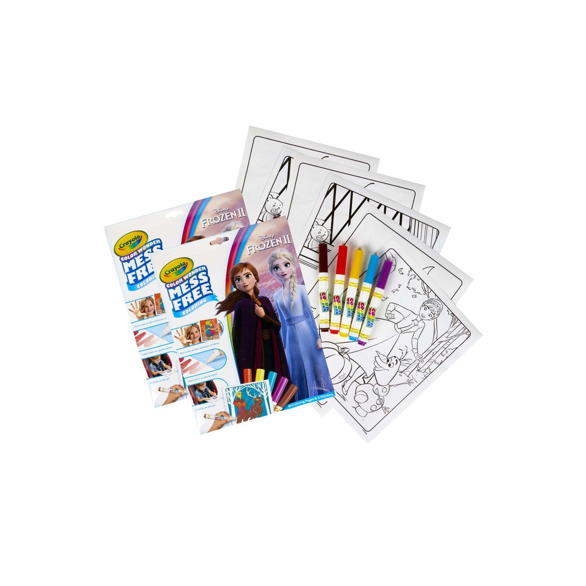 Bring home the joy of Disney's Frozen 2 with a mess free coloring experience! Color Wonder Markers only show up on specially formulated Color Wonder Paper, so no stains on skin, clothing, or furniture. The envelope-style packaging doubles as a unique storage solution, allowing these coloring activities for kids to be taken on the go or used at home. Makes a great gift for girls and boys. Ages 3 and up. Each Color Wonder Coloring Set contains 5 Mess-Free Markers and 18 Coloring Pages with their favorite characters from Frozen 2. Sold as a pack of 2 complete sets.