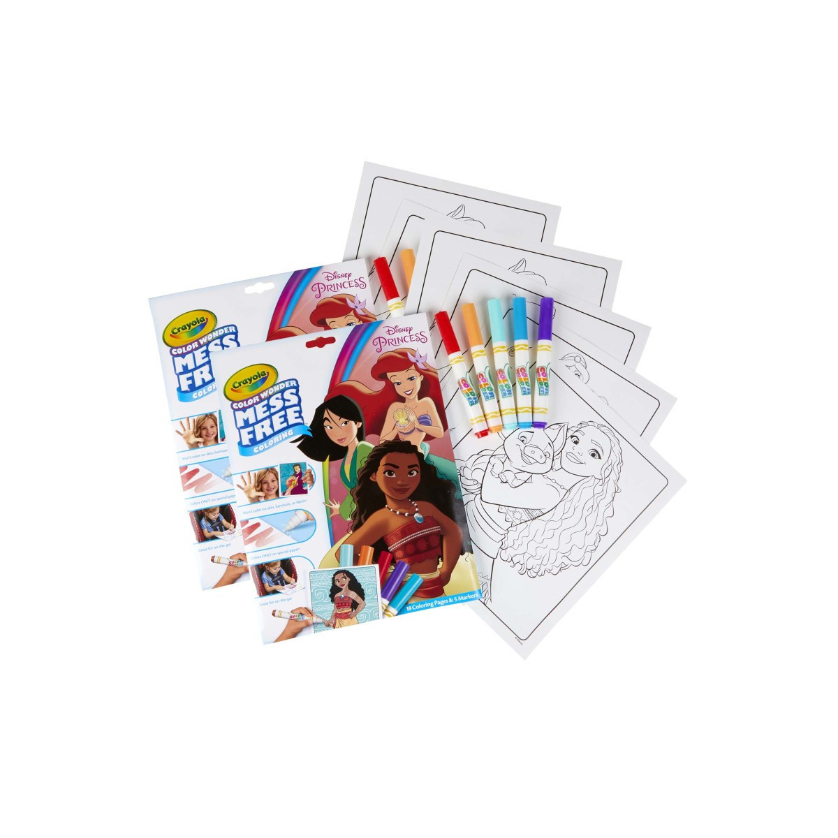 Crayola Color Wonder inks appear only on special Color Wonder Paper—not on skin, clothing or carpets! Each set contains 18 Disney Princess Coloring Pages and 5 Color Wonder Markers. Folder style packaging works as reusable storage for your coloring pages and markers. Works with all Color Wonder paints, markers, and stamps. Makes the perfect addition to any Disney Princess collection. Included art features Belle, Jasmine, Ariel and more. Sold as 2 complete sets.