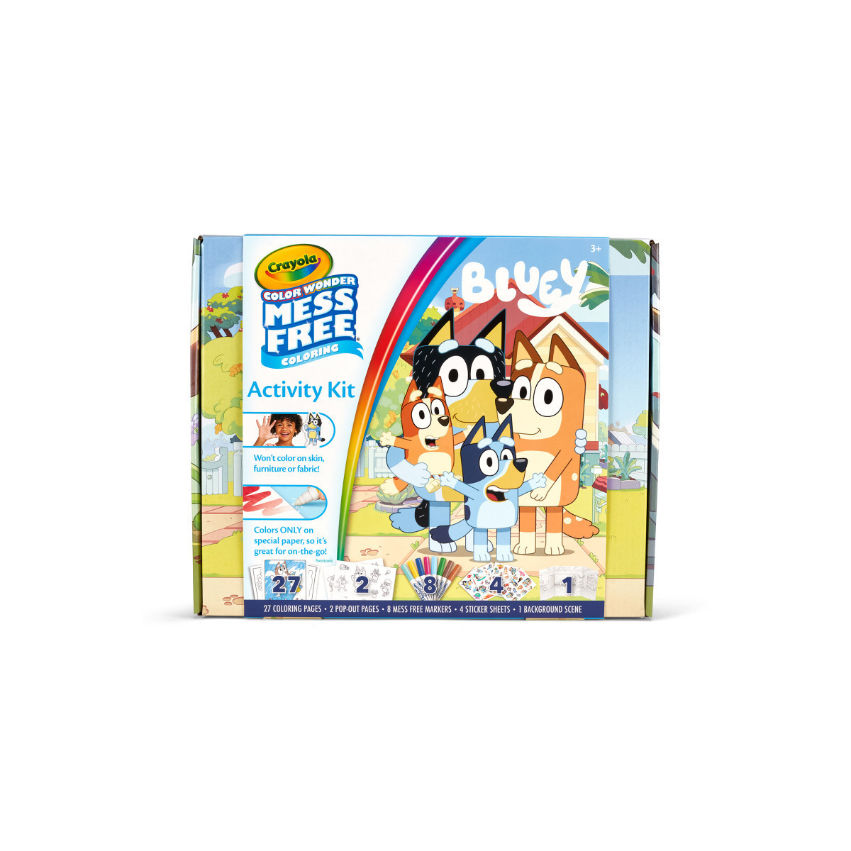 Experience a whole new level of imaginative play with the Bluey Color Wonder Activity Kit by Crayola. This enchanting set, bustling with fan-favorite preschool character Bluey and buddies, lets your little one immerse themselves in a world of vibrant colors! Featuring 27 spacious 8" x 10" coloring pages — each filled with captivating scenes, it offers endless opportunities to unleash their artistic flair. This unique kit isn't just for coloring; it's a gateway to creative role-play. With 2 diecut cardstock pop-out characters and a trifold background, kids can explore multidimensional play, forging memorable tales with their colored characters! But the fun doesn't stop there. Our mess-free markers ensure worry-free coloring, liberating young creators from the fear of stains or spills.