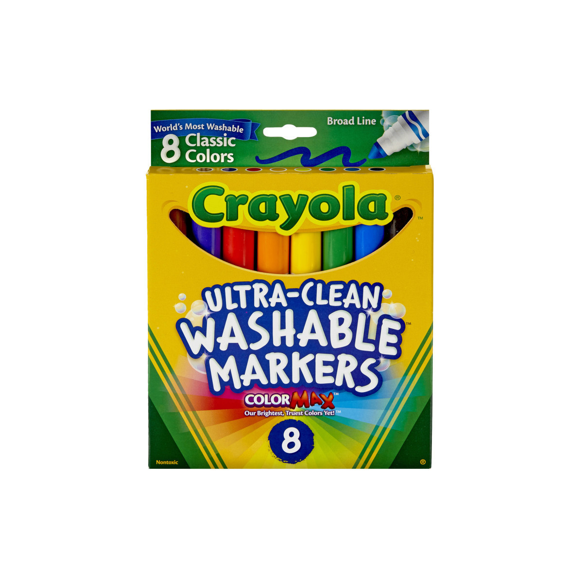 Kids love to get creative with color, but parents want to keep the color where it belongs and easily remove it where it doesn't! The world's most washable non-toxic markers now come in an improved Ultra-Clean formula that washes easily from skin, clothing, and common household surfaces—even painted walls. Classic Broad Line Markers provide artists with eight classic Crayola colors that feature Color Max, our most vibrant color yet. Amp up school projects and artistic endeavors with high-quality ink that is true to color. The variety of bright colors in this pack invites imaginative expression. With its conical tip, the Classic Broad Line Marker is a versatile drawing tool. Perfect for coloring in large areas, these markers are also great for drawing thin lines or dots. Kids can even create a ribbon effect with lines that taper from thick to thin. Broad line markers lay down plenty of color and won't smudge or bleed through paper. Crayola Markers contain recycled resin, which puts over a million pounds of plastic back to use. Bring beauty and color to your world and help keep plastic out of landfills. Each box includes 8 Ultra-Clean Washable Broad Line Markers in classic colors and peggable box.