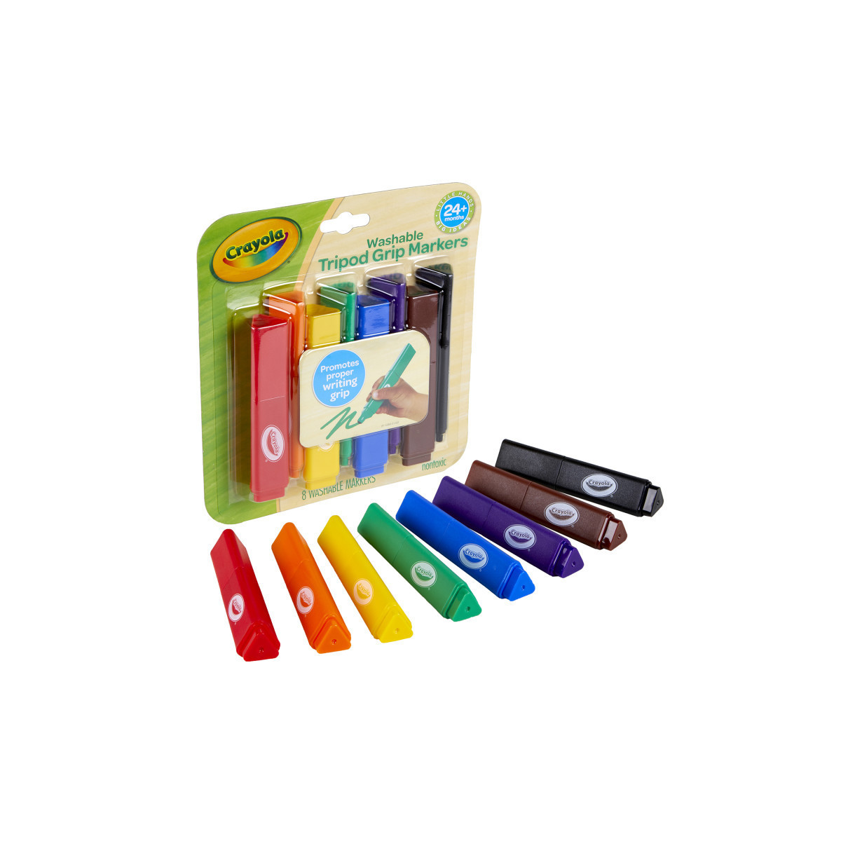 These Ultra-Clean Washable Tripod Grip Markers are perfect for the beginning artist. The triangular shape is easy to grasp while guiding little fingers to a proper writing grip. The triangular shape also prevents markers from rolling away and getting lost. Includes 8 different marker colors with crush-proof gumball nibs that are formulated for easy clean up. For 24 months and up.