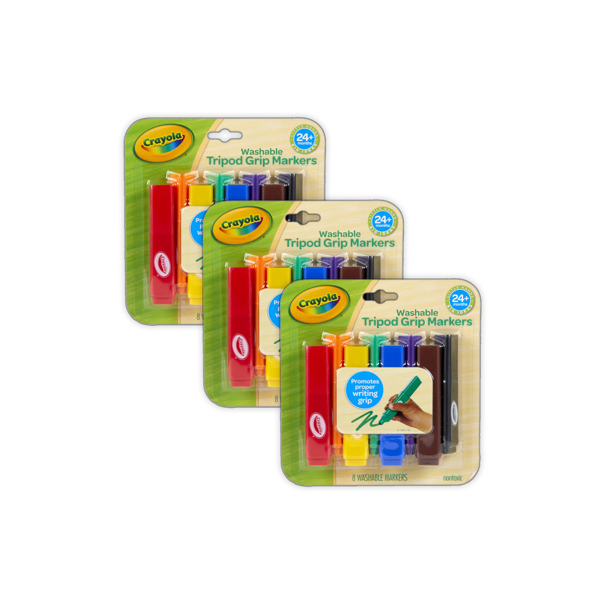These Ultra-Clean Washable Tripod Grip Markers are perfect for the beginning artist. The triangular shape is easy to grasp while guiding little fingers to a proper writing grip. The triangular shape also prevents markers from rolling away and getting lost. For 24 months and up. Each pack includes 8 different marker colors with crush-proof gumball nibs that are formulated for easy clean up. Sold as 3 packs for a total of 24 markers.