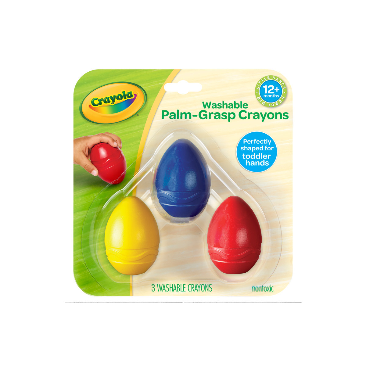 My First Crayola art tools provide children their first art supplies made especially for their little hands so they can create. These 3 palm-grasp, egg-shaped washable crayons are sized to fit toddlers' hands so they can easily make their first marks. Each egg is the equivalent of 14 regular crayons! Includes 3 crayons (red, blue, yellow) for 12 months and up. AP Certified nontoxic.