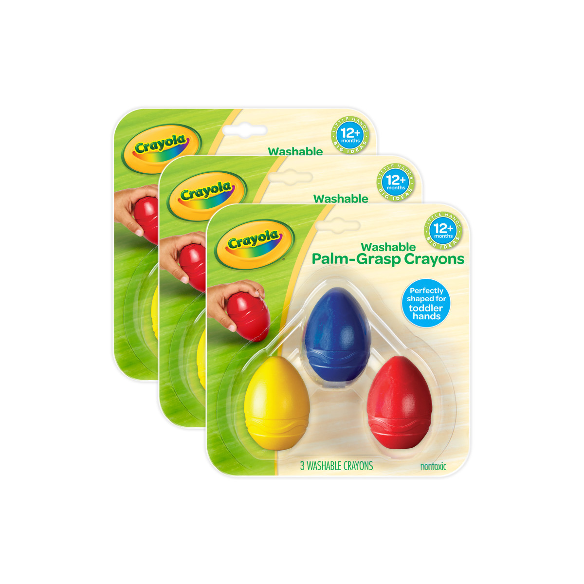 My First Crayola art tools provide children their first art supplies made especially for their little hands so they can create. These 3 palm-grasp, egg-shaped washable crayons are sized to fit toddlers' hands so they can easily make their first marks. Each egg is the equivalent of 14 regular crayons! For 12 months and up. AP Certified non-toxic. Each pack includes 3 crayons (red, blue, yellow). Sold as 3 packs for a total of 9 crayons.