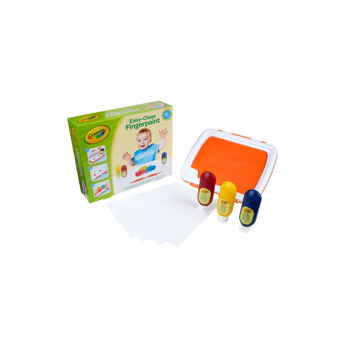 The Crayola Easy-Clean Finger Paint Set offers kids the tactile thrill of creating with their hands without all the mess! Little artists can finger paint on top of the flexible covering while the paint and paper are contained under the locked lid to contain the mess! And the finger paint unit can easily be washed in the sink or on the top rack of the dishwasher. Features Finger Paint Unit, 3 (5 oz) Squeeze Bottles of Washable Finger Paint, and 10 Sheets Finger Paint Paper. The included Crayola Washable Paint colors include bold hues of Red, Blue and Yellow. The paint washes from skin and most washable clothing. Ideal for toddlers age 1 and up.