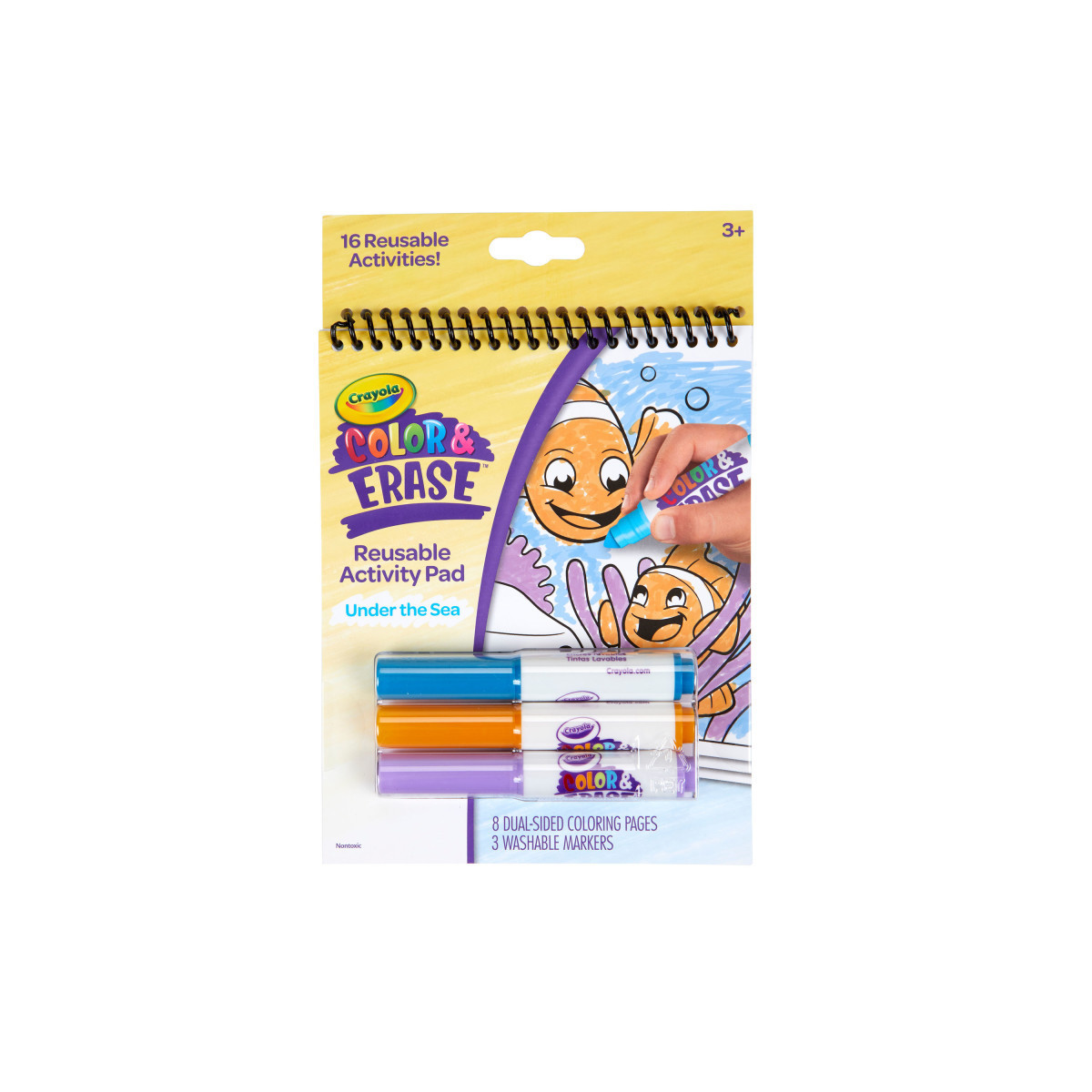 Crayola Color & Erase Reusable Activity Pad: Under the Sea lets kids color delightful ocean-themed coloring pages with vibrant, washable markers. It's never been easier to color, wipe clean, and color again. This reusable activity pad is all parents need to give kids screen-free art time while traveling. Double-sided pages mean 16 different scenes to explore. All Crayola Color & Erase products offer less-mess art experiences that kids can create again and again! Each item in the line produces vibrant colors on surfaces that can be easily erased with a damp cloth. Each Activity Pad includes 8 Dual-Sided, Reusable, 5" x 7" Activity Pages and 3 Washable Markers. Safe and nontoxic, this set is the ideal practice-makes-perfect activity for young artists ages 3 and up.
