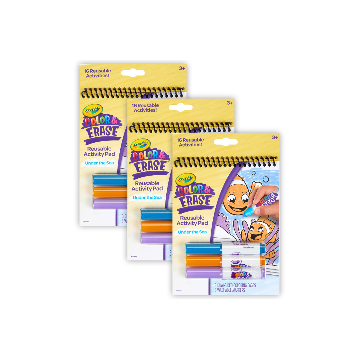 Crayola Color & Erase Reusable Activity Pad: Under the Sea lets kids color delightful ocean-themed coloring pages with vibrant, washable markers. It's never been easier to color, wipe clean, and color again. This reusable activity pad is all parents need to give kids screen-free art time while traveling. Double-sided pages mean 16 different scenes to explore in each activity pad. All Crayola Color & Erase products offer less-mess art experiences that kids can create again and again! Each item in the line produces vibrant colors on surfaces that can be easily erased with a damp cloth. Each Activity Pad includes 8 Dual-Sided, Reusable, 5" x 7" Activity Pages and 3 Washable Markers. Safe and nontoxic, this set is the ideal practice-makes-perfect activity for young artists ages 3 and up. Sold as a pack of 3 Activity Pads.