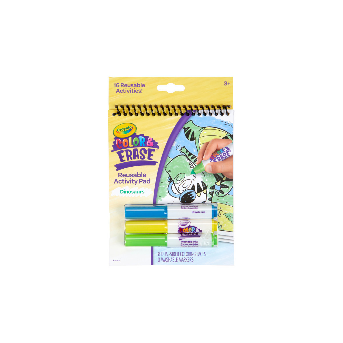 Crayola Color & Erase Reusable Activity Pad: Dinosaurs lets kids get creative with coloring pages depicting dinosaurs and other prehistoric creatures using vibrant, washable markers. It's never been easier to color, wipe clean, and color again. This reusable activity pad is all parents need to give kids screen-free art time while traveling. Double-sided pages mean 16 different scenes to explore. All Crayola Color & Erase products offer less-mess art experiences that kids can create again and again! Each item in the line produces vibrant colors on surfaces that can be easily erased with a damp cloth. Each Activity Pad includes 8 Dual-Sided, Reusable, 5" x 7" Activity Pages and 3 Washable Markers. Safe and nontoxic, this set is the ideal practice-makes-perfect activity for young artists ages 3 and up.