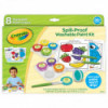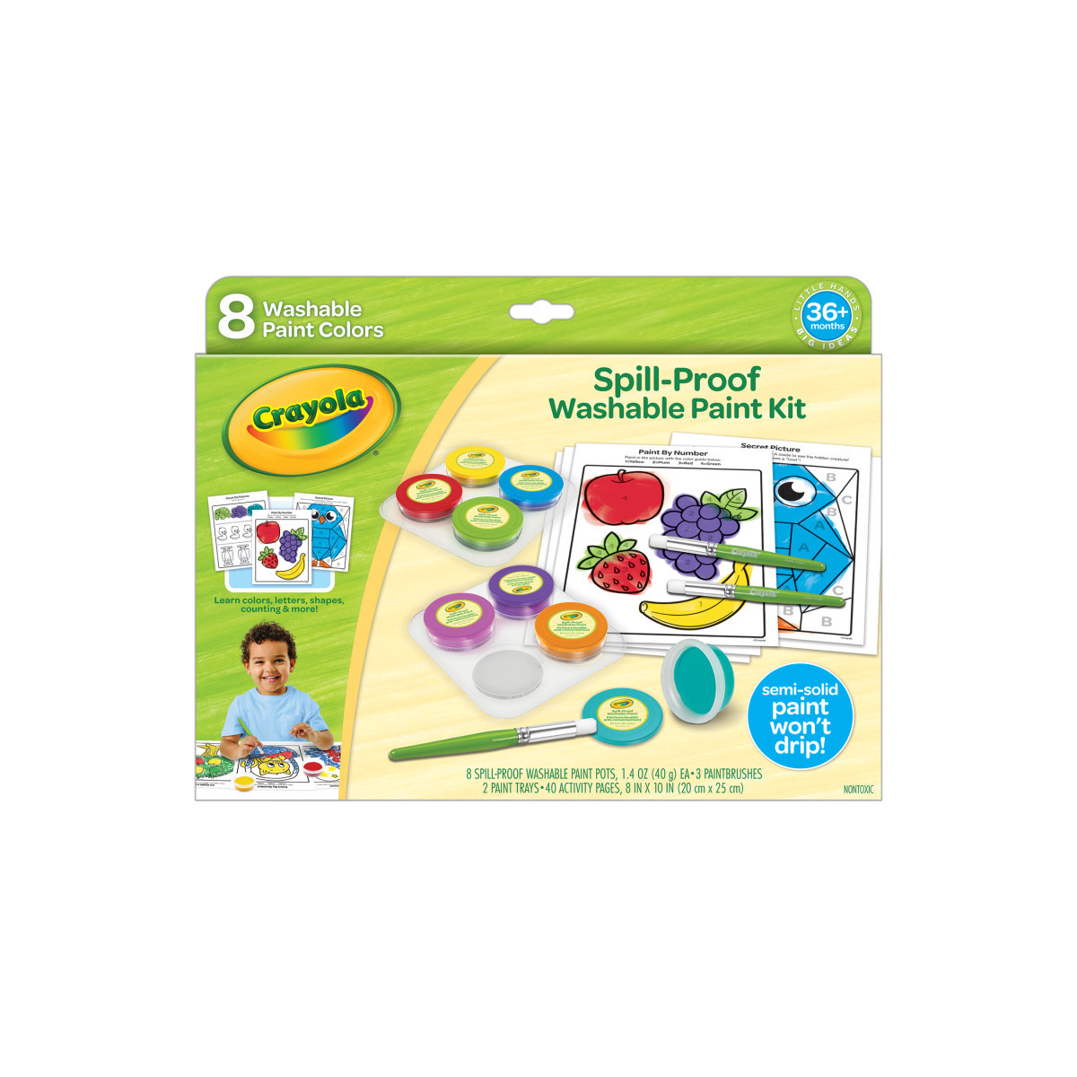 TODDLER PAINT SET: The Crayola Spill Proof Paint Set features 8 Washable Spill Proof Paints in Reusable Jars, 3 Paint Brushes, 2 Paint Trays, and 40 Fun, Educational Activity Pages.