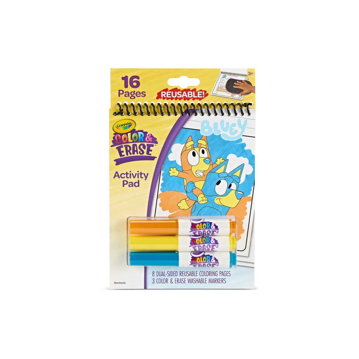 Join your favorite lovable pup on a fun and unpredictable adventure that's as infinite as your imagination! The Crayola Color & Erase Reusable Activity Pad lets Bluey fans enjoy a unique coloring experience across 8 dual-sided coloring activity pages, which can be colored & erased repeatedly. It features 3 Color & Erase Washable Markers that are easy to wipe off the pages with a damp cloth, and wash cleanly from skin and most washable clothing. This coloring set makes a great gift and a creative alternative to Bluey toys! It is nontoxic and safe for boys and girls, ages 3 & up!