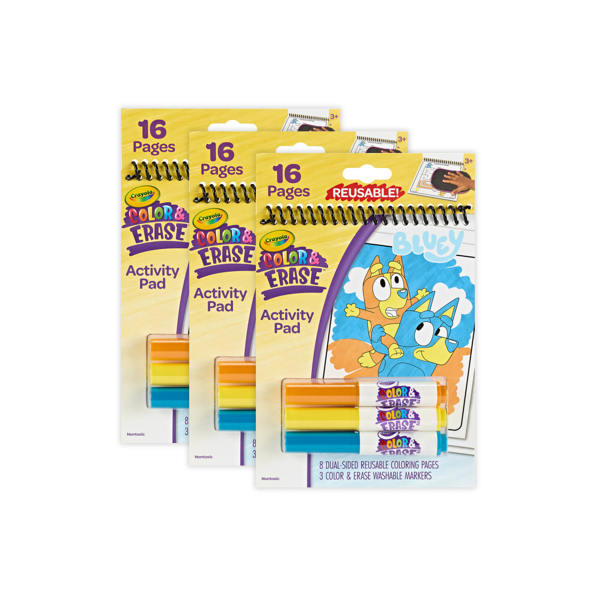 CRAYOLA BLUEY ACTIVITY PAD: Sold as a pack of 3 activity pads, each activity pad features 8 dual-sided 5" x 7" reusable coloring activity pages and 3 washable markers.