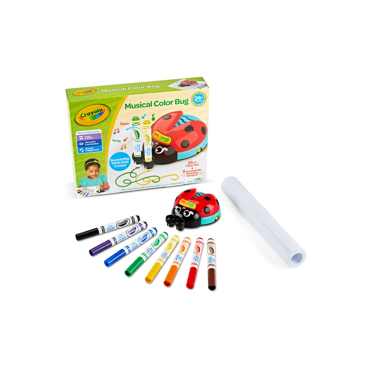 Music & creative play are the perfect companions, especially when little artists are learning to explore their imagination on paper. This unique coloring set connects visual & musical art to make coloring play engaging and fun for kids. Load 2 of the 8 Ultra Clean Washable Markers into the Doodle Bug's antennae and select a sound mode to get started creating. As the Doodle Bug is moved around, different sounds will play based on the movements as kids color. Choose from whacky sounds with Doodle Bug Mode or Songs with Music Mode. Kids can also color without music by selecting silent mode, or lower and raise the volume as needed. The Musical Doodle Bug makes a great educational toy for toddlers, by helping them realize cause-and-effect, as well as improve their focus, motor skills, and hand-eye coordination! It features 1 Doodlebug Toy with 8 different pre-programmed sounds, 15 Giant 20"x 11" Blank Coloring Sheets in an easy-to-use perforated roll, and 8 Ultra Clean Washable Markers. It's a great toy for toddlers & kids, ages 2 & up.
