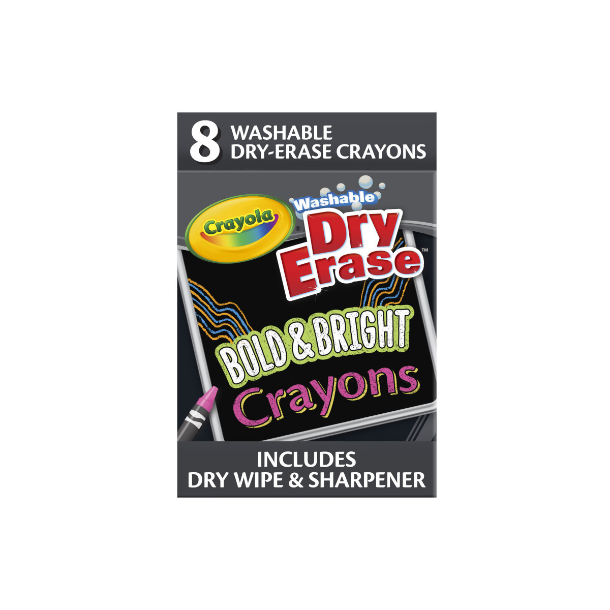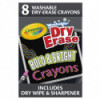This pack of crayons includes eight bright colors that show up strikingly on whiteboards and other dry-erase surfaces. Whether you want to create an eye-catching sign or just want to doodle, these crayons are great for all sorts of artistic applications. And thanks to the included sharpener, you'll always have a fine, pinpoint nub to draw with. Crayola Dry Erase Crayons are fully washable and do not stain clothes, or skin, so parents can have peace of mind while their children draw. Tougher marks can easily be washed away by hand using just water. Each pack includes 8 washable dry-erase crayons, E-Z erase cloth, and built-in crayon sharpener.