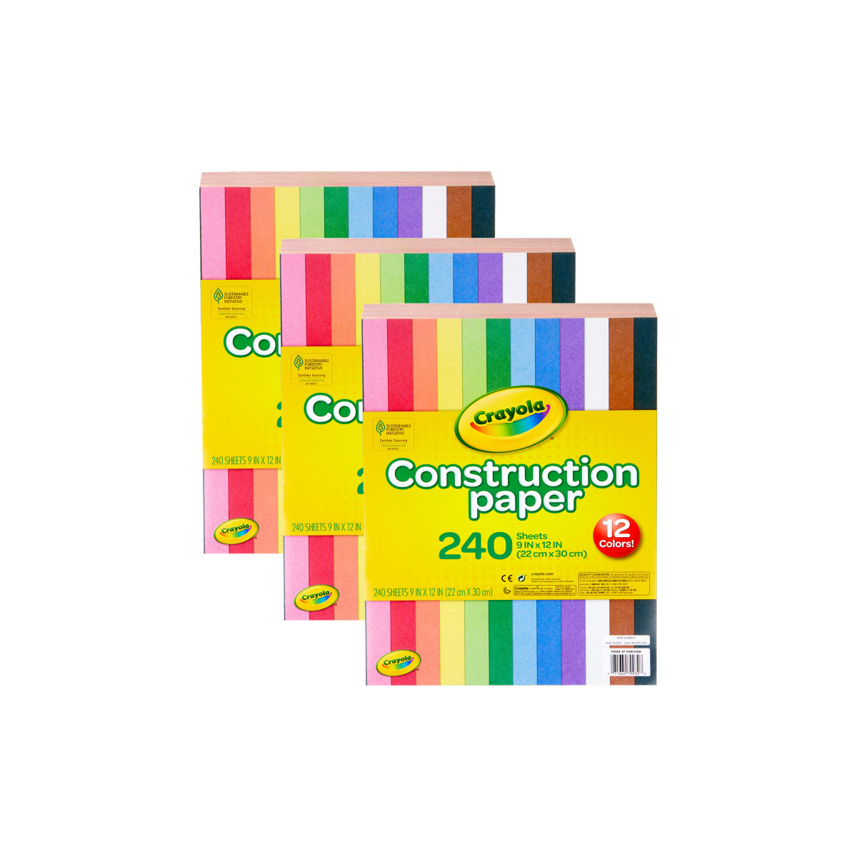 Crayola Construction Paper is a must-have for home and school projects. Each pack includes 240 sheets of construction paper in standard 9x12 paper size. There are 12 different colors including: Pink, Red, Orange, Yellow, Light Green, Green, Light Blue, Blue, Violet, White, Brown and Black. Sold as 3 packs for a total of 720 sheets.