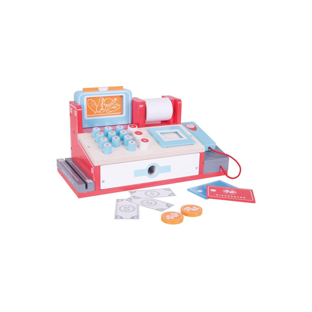 The Bigjigs Toys wooden Shop Till with Scanner is a great addition to any Pretend Play Shop. Keen sales assistants can scan the items using the scanner, offer different payment methods including credit card and cash, and even create a receipt for their customer! This wooden cash register is a great way to introduce little ones to numbers and mathematics, developing thinking, counting, addition, subtraction and reasoning skills. Encourages creative and imaginative role play. Made from high quality, responsibly sourced materials.