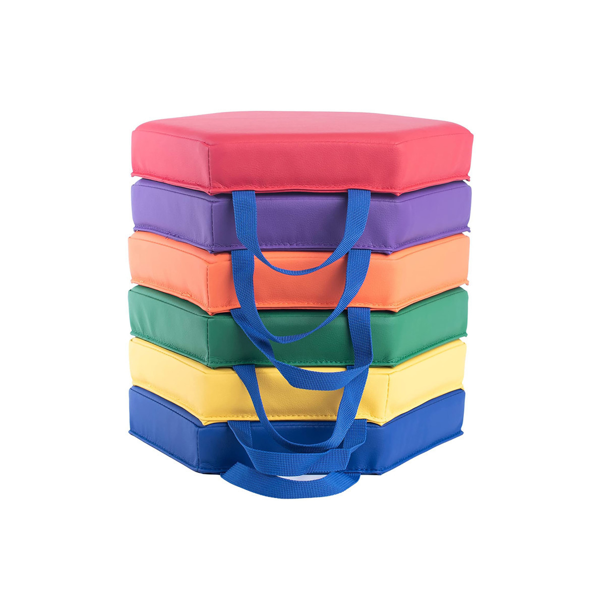 Spot markers help children recognize where it is appropriate for them to sit. The fun, color coded, cushioned markers encourage children to stay seated, while letting them fidget and shift, on the floor cushion. The cushions are versatile and can be used as stepping stones to help develop hand-eye coordination, balance, sensory processing, and body awareness. The floor cushions are durable and washable, making them very practical for home, and school use. The built in handle makes transporting them easy for young students. Set of 6 hexagon shaped floor cushions measuring 13" x 13" x 2".