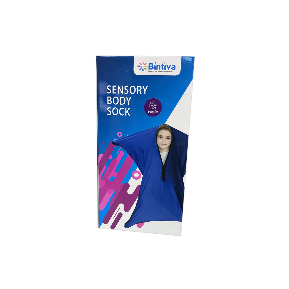 The body sock is a fun and exciting tool providing a compression hug throughout their body for children that crave sensory input. The sack is also recommended for developing motor planning skills, while establishing spatial and body awareness. Sensory sox are also used by professionals to organize, and calm children's minds before and after therapy sessions. The Bintiva compression sock is free of any adhesive type fasteners, so that no part of the hair, or body will get stuck. The sock is secured by utilizing simple to use snaps. The sensory sock is appropriate for children with sensory processing disorder (SPD), ADHD, autism, and typical children that enjoy the feeling of a hug. Includes 1 large sensory sock great for ages 8-11.